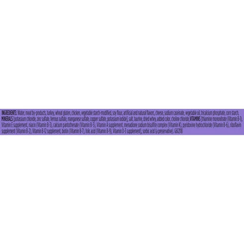 - Ingredients; Water Sufficient for Processing, Meat By-Products, Turkey, Wheat Gluten, Chicken, Corn Starch-Modified, Soy Flour, Cheese, Artificial and Natural Flavors, Tricalcium Phosphate, Soybean Oil, Potassium Chloride, Dried Egg Product, Taurine, Salt, Added Color, Whey, Sodium Caseinate, Choline Chloride, Mono and Dicalcium Phosphate, Sodium Tripolyphosphate, Thiamine Mononitrate, Vitamin E Supplement, Zinc Sulfate, Ferrous Sulfate, Sorbic Acid (a Preservative), Carrageenan, Niacin, Calcium Pantothenate, Copper Sulfate, Vitamin A Supplement, Manganese Sulfate, Menadione Sodium Bisulfite Complex (Vitamin K), Pyridoxine Hydrochloride, Riboflavin Supplement, Vitamin B-12 Supplement, Biotin, Folic Acid, Vitamin D-3 Supplement, Potassium Iodide. E-6121.