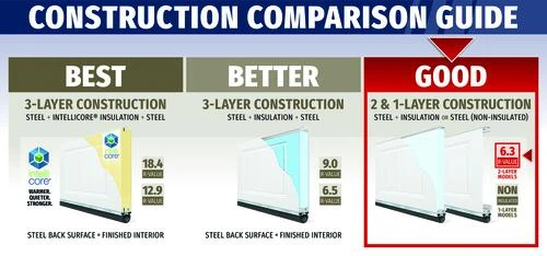 Designer Steel Panel garage doors feature versatile grooved panel designs and window options to give your home a stylish look. This Good construction garage door has vinyl backed insulation. It offers dependable construction with long-lasting operation providing you with a great door to suit your home and lifestyle.