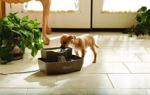 The PetSafe® Drinkwell® Multi-Tier Pet Fountain provides 100 ounces of fresh, filtered water for your pet. A carbon filter removes bad tastes and odors, while the free-falling stream continually aerates the water with oxygen. This fountain features an elevated level and a lower bowl to give your pet two options for staying hydrated.
