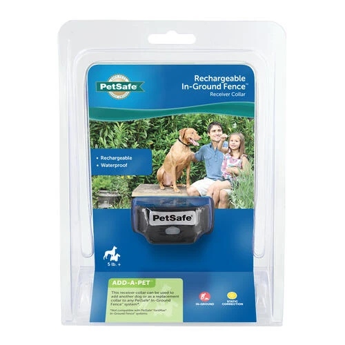 The PetSafe® Rechargeable In-Ground Fence Add-A-Dog® Receiver Collar is a lightweight, waterproof receiver collar. The collar has 4 levels of static correction and tone-only mode to customize to your pet’s personality. Works with PetSafe® In-Ground Fence? systems except YardMax® and UltraSmart® systems. This collar is compatible with the following PetSafe In-Ground Fence systems: PIG00-14673, PIG00-13661, PIG00-10777, PIG20-11041, PCF-1000-20 and PIG00-14582. Not compatible with PetSafe Wireless, PetSafe UltraSmart®, PetSafe YardMax ® or Innotek® systems.