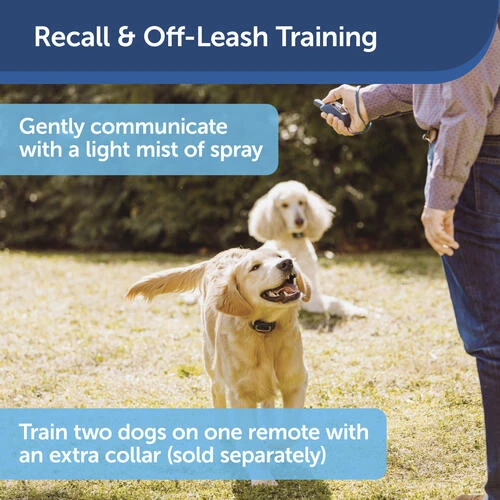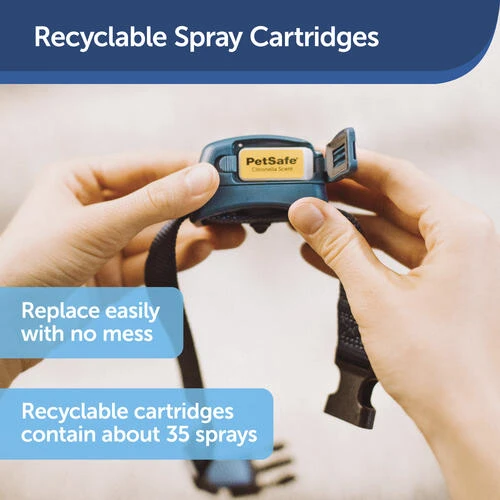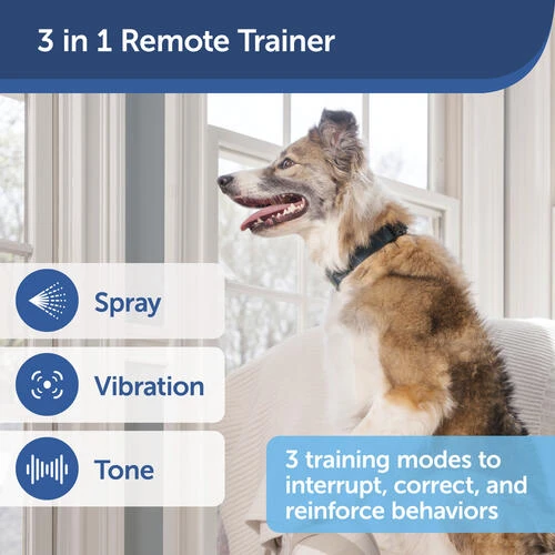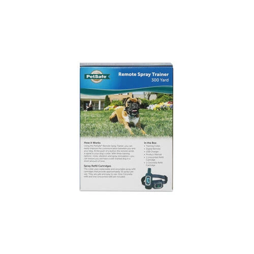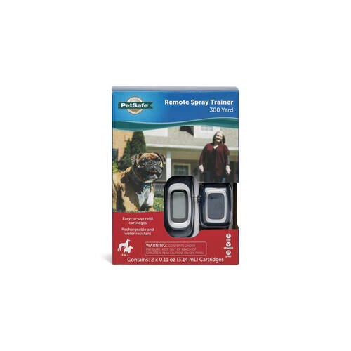 A little spray helps keep unwanted behaviors away with the PetSafe® Remote Spray Trainer. This safe, all-in-one training solution allows you to improve your dog’s behaviors with three easy-to-use training modes: tone (beep), vibration, and spray. When your dog does something he or she shouldn’t do, such as bark at the door, chew on the furniture, or dig in the yard, simply press a button on the handheld remote to release a gentle burst of spray from the collar. The spray trainer comes with two spray cartridges in two scents, unscented and citronella (try both to see which one works best for your dog). Each replaceable, recyclable spray cartridge contains 35 sprays. With a 300-yard range, you can train your dog around the house or in the backyard. This lightweight collar fits pets eight pounds and up and adjusts to fit neck sizes up to 27 inches. The rechargeable handheld remote and collar quickly charge within two hours (using the included USB charger) and have a 40-hour battery life (depending on use). With a little training, your best friend will soon be the most well-mannered dog in the neighborhood! PetSafe® brand is here to help you and your pet live happy together™.