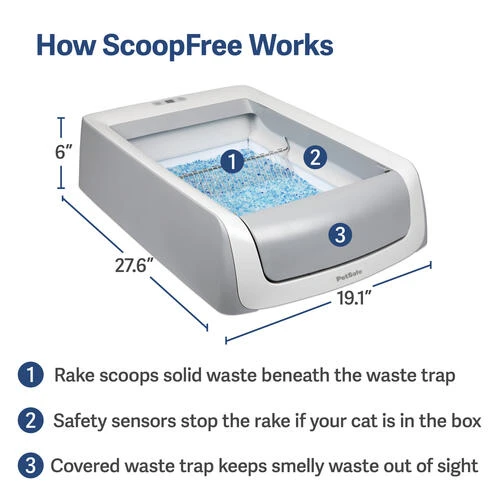 Strike scooping the litter box off your to-do list. With the ScoopFree® Self-Cleaning Litter Box, there’s no scooping, cleaning or refilling your cat’s litter box for weeks. It uses crystal litter which provides 5 times better odor control than traditional clumping litter. Crystal litter absorbs urine and dehydrates solid waste. This low-tracking litter also helps keep your floors clean because it is 99% dust free and doesn’t stick to your cat’s paws. Safety sensors ensure that the scooping cycle only occurs when your cat is out of the box. It uses disposable trays that have a plastic lining to help protect against leaking, and each tray comes with a lid for quick and easy disposal. Just remove the tray and throw it away. There’s even a health counter that tracks how many times your furry feline uses the box, which is a convenient way to detect early signs of a health issue. PetSafe® brand is here to help you and your pet live happy together™.