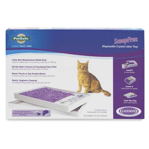 Each ScoopFree® disposable Crystal Litter Tray is pre-filled with lightly scented lavender crystal litter, so all you have to do is load the tray in the litter box with no scooping, cleaning or refilling for weeks! These trays reduce mess in your home with a plastic lining to fight leaks, and with low-tracking crystals that stick inside the box instead of on your cat?s paws. Crystal litter absorbs urine and dries solid waste to quickly remove odors 5 times faster than clumping clay litter. When it?s time to clean up, just remove the disposable litter tray and throw it away. It doesn?t get much easier than that! These replacement trays are compatible with ScoopFree® self-cleaning cat litter boxes. Your pet deserves the best. Trust PetSafe® to help keep your pet healthy, safe and happy.